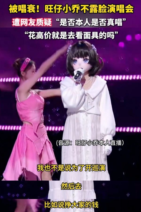 起因是“旺仔小乔”这个蒙面网红要线下举办演唱会,可她带着个头套,那观众也不知道是真唱还是假唱啊。