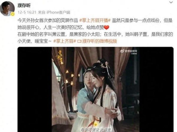 12月5号两条微博,老濮家这是捅了马蜂窝。外孙女韩子萱演《掌上齐眉》里的萧家小太阳,戏份加起来可能都不到三分钟,愣是被说成“星三代硬闯演艺圈”。