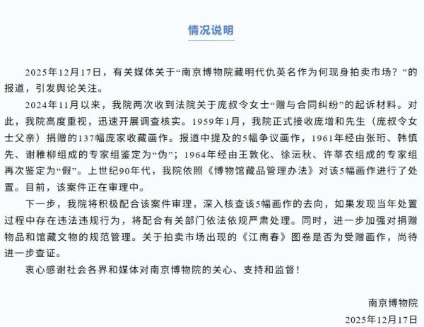 2025年12月17日,有关媒体关于“南京博物院藏明代仇英名作为何现身拍卖市场?”的报道,引发舆论关注。