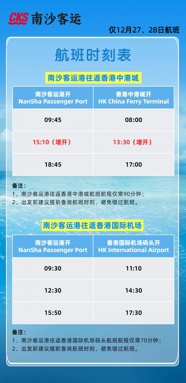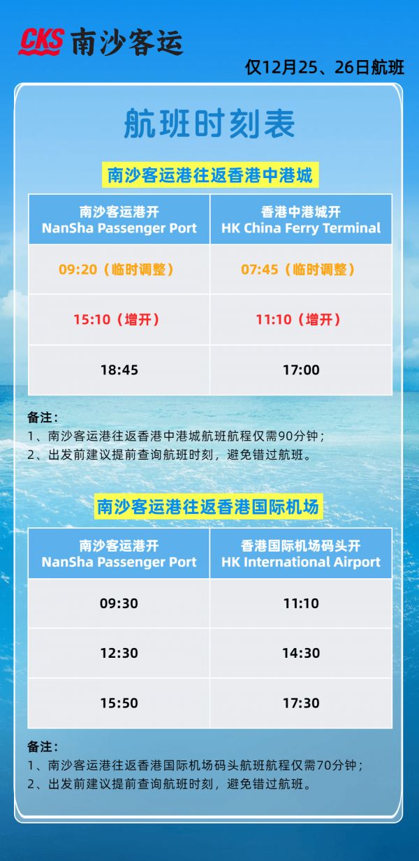 随着香港公众假期的临近,为保障期间旅客顺畅出行,满足广大旅客的出行需求,12月25日至28日,南沙客运港往返香港中港城航线将临时增开航班 ,具体时间安排如下: