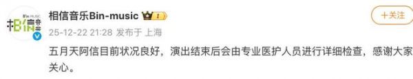不过好在阿信身体没有任何状况,后续工作室也有发布声明报平安,相信音乐也在第一时间发声替阿信报平安,同时表示阿信目前状况良好,演出结束后就会由专业医护人员进行详细检查,感谢大家的关心。