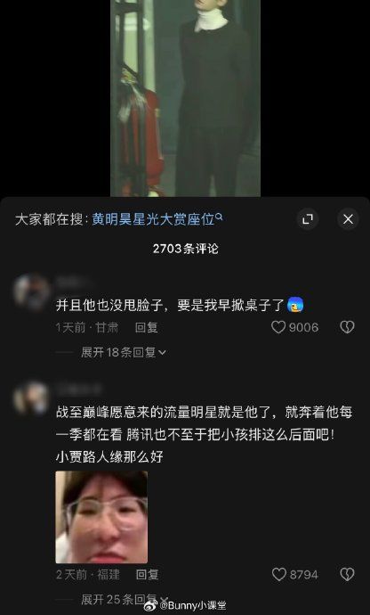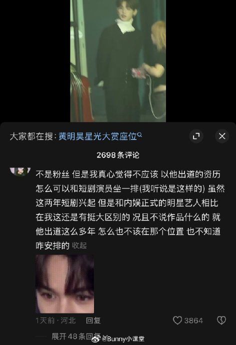 黄明昊在星光大赏的座位引发粉丝不满!黄明昊被安排在内场第四排,和短剧艺人坐在一起……黄明昊坐了一会之后离开座位,工作人员多次沟通后他才重新落座。有的人认为以黄明昊的热度不至于安排在第四排,也有人认为黄明昊出道多年仍没有代表作,坐在第四排合情合理,大家怎么看