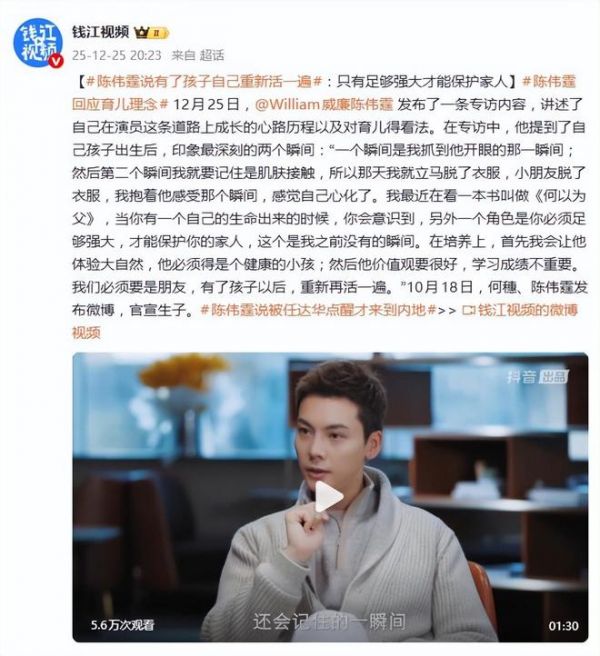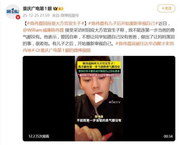 据12月25日报道,近日,陈伟霆在专访中大方回应官宣生子一事,一句“我不能连第一步当爸的勇气都没有”,瞬间在社交平台刷屏。这波坦诚操作,不仅没掉粉,反而让网友直呼“真男人担当”,也让大众看到了这位舞台“酷盖”转身为“烟火气父亲”的内心剖白。