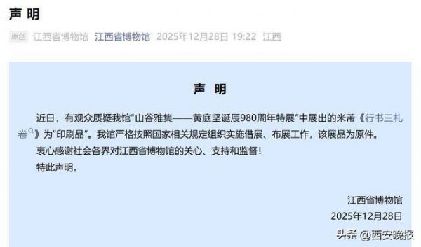 12月28日下午,江西省博物馆发布声明,声明称,有观众质疑我馆“山谷雅集——黄庭坚诞辰980周年特展”中展出的米芾《行书三札卷》为“印刷品”。我馆严格按照国家相关规定组织实施借展、布展工作,该展品为原件