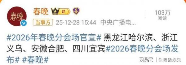 那么,究竟哪些明星艺人登台演出?这一答案有待揭晓!从公开的消息来看,与2026年春晚场地有关的四座城市,却榜上有名!黑龙江省哈尔滨市。浙江省义乌。安徽省合肥市。四川省宜宾。春晚媒体在社交平台发文,公布了这个好消息!