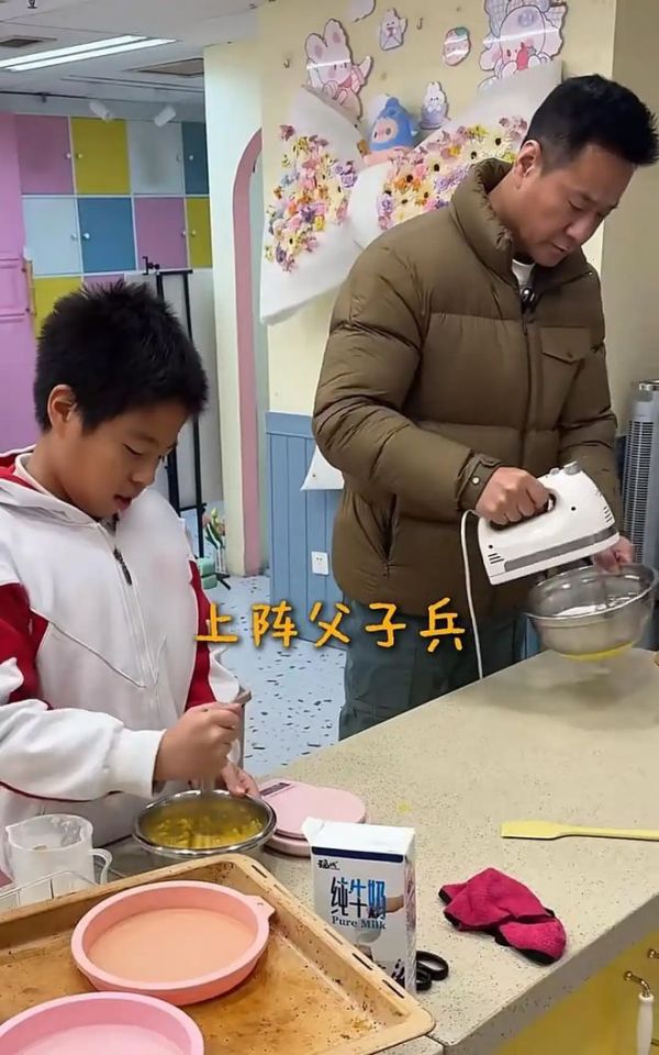 镜头里这对 “直男组合” 分工明确:连奕名挽着袖子搅面糊,手腕发力的架势像在拍武打戏;大福踮着脚打蛋清,打蛋器溅出的泡沫沾到鼻尖也浑然不觉,活脱脱缩小版 “硬汉萌娃”。