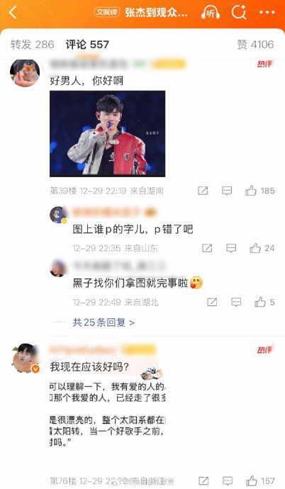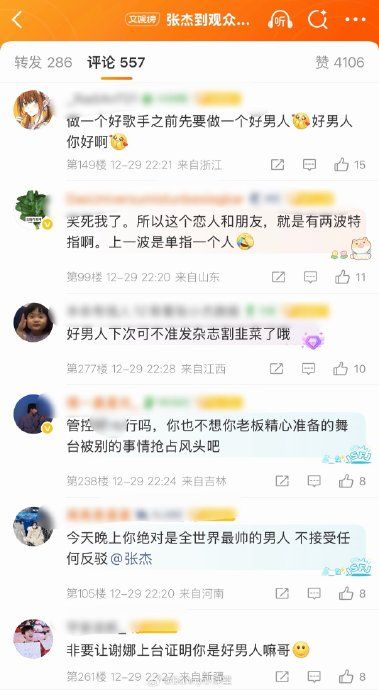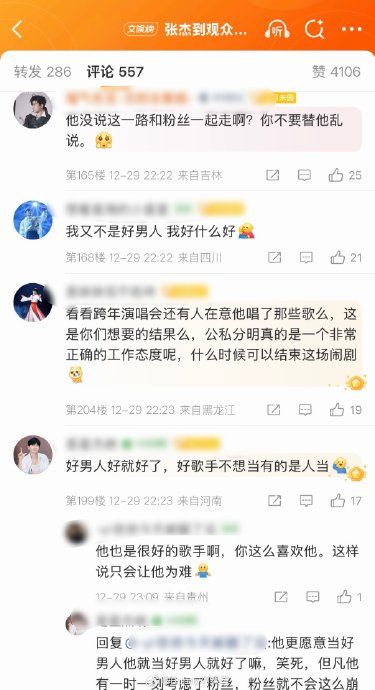 张杰演唱会回应争议:我和那个我爱的人,已经走了很多年,经历了很多事。当一个好歌手之前,我要先当一个好男人,对吗? 粉丝评论呈现完全的两极状态,一方说尊重张杰爱屋及乌,一方在张杰工作室评论区留言,讽刺张杰“好男人”人设,一定要让谢娜上台来证明他是好男人吗?好男人好就好了,好歌手不想当有的是人当。大家怎么看粉丝这种行为?是反应过度?还是梦女心态作祟?
