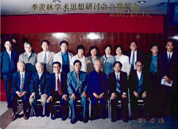2001年10月15日,朱威烈应邀参加季羡林学术思想研讨会,并做主旨发言(前排右三为季羡林,左三为朱威烈)。