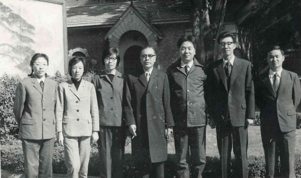 1980年春,中国驻埃及大使姚广(图中)与中国在埃进修教师合影(右二为朱威烈)。