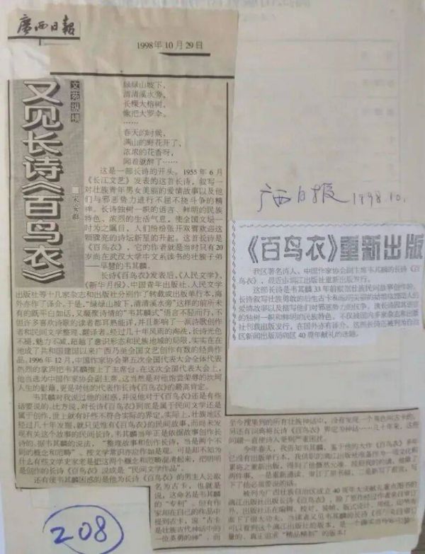 我当时在《广西日报》文艺版发了一篇短文《又见长诗<百鸟衣>》(《广西日报》1998年10月29日)说及了此事。