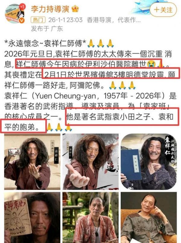 香港著名武术指导、演员袁祥仁于2026年1月1日因病去世,享年69岁 ,非常痛心