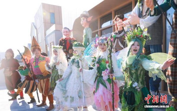 1月2日,元旦假期,乌镇戏剧节开年大巡游——《艾尔夫奇境之旅》在北京城市副中心商业地标——“湾里”上演。图为巡游演员与市民互动合影。中新社记者 贾天勇 摄