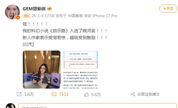 邓紫棋于1月4日发博称“入选银河奖”,表示“新人作家受宠若惊”,其工作室及粉丝账号同步宣传。