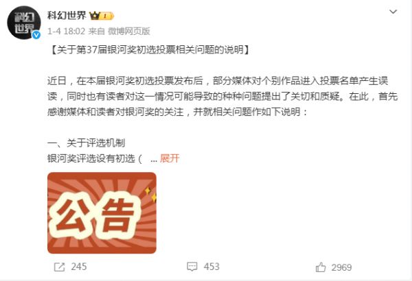 银河奖组委会(@科幻世界)于1月4日发布声明,强调三点:
