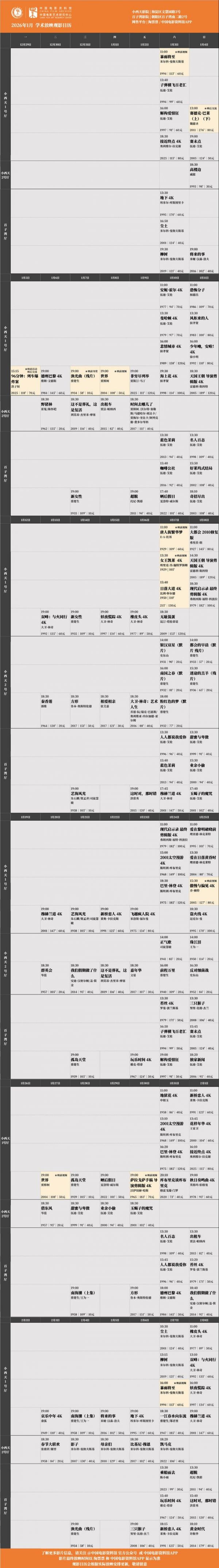 全新专题策划将从今年3月开启,两位大师的个人影展将在京苏分别呈现。本月重磅加场活动还在路上,下周发布。所有场次均可在淘票票、中国电影资料馆APP购票,具体排片见末图,祝大家观影愉快。❤️