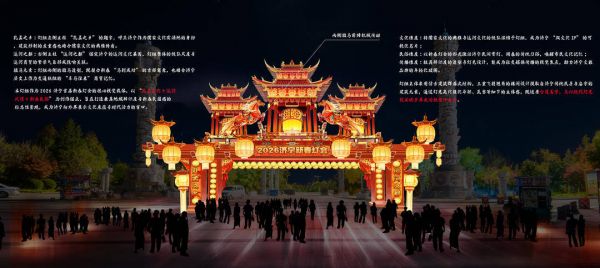从“唤醒”沉睡的文化记忆,到“焕新”传统的节庆形态,再到全城沸腾的“欢腾”。作为2026济宁太白湖新春灯会的核心视觉载体,主灯组以“孔孟文化+运河风情+新春民俗”为创作锚点,采用仿古建筑群落式结构,三重飞檐翘角提取自济宁传统民居与庙宇元素,通过灯光亮化强化斗拱、瓦当等细节的立体感,既还原古建美学,又以现代幻光技术赋予夜间视觉冲击。它不仅是兼具地域辨识度与新春氛围感的标志性景观,更成了济宁向外界展示文化底蕴与时代活力的窗口。