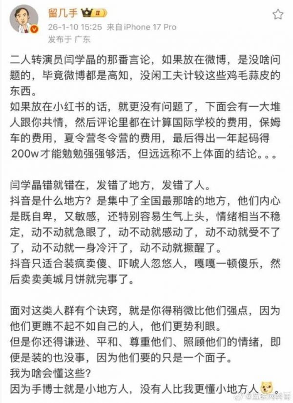 这话一出,评论区直接分裂成两派。有人说 “手哥还是这么敢说”,有人骂他 “刻板印象玩得溜”。但不得不承认,他确实戳中了点 —— 闫学晶的言论要是换个平台,结局可能真不一样。