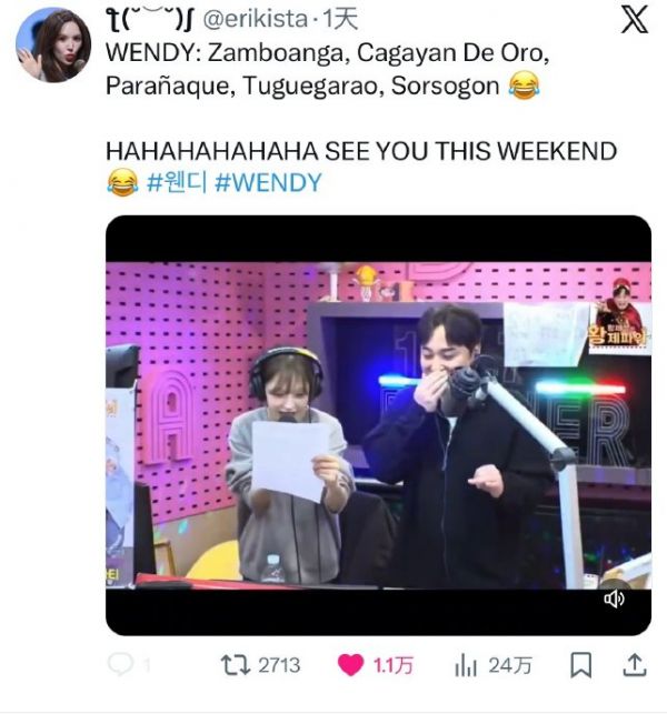 #WENDY_WORLDTOUR##solo歌手孙胜完# 260115 Wendy 黑X相关万赞一则 cr.erikista‘’在周二出演的SBS电台中,完D的读稿挑战cut获黑X万赞 ‘’️个人账号 _个人微博@todayis__WENDYFromm翻译群 审核长期招新