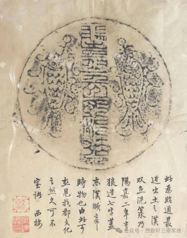 今年夏,周子滨先生购获古铜器二于水塘子铜工家,云自梁堆中新掘出。余亟借观,大小各一,无何等字画。惟始悟古物出土,村民无识,大抵售之业铜者。暇日邀张汝成步街而户问,庶未所获。未逾月有铜工携两汉洗造门笑曰:“此物收买三年矣。闻先生要,故特送来。惜底为锄伤!”余瞿然注视,一深如罂,一浅如盂。深者高约八寸,口径尺许,底穿如筛,孔径寸。中置盘一,未审何用;浅者高可六寸,口径盈尺,底左右两鱼,中篆书七字曰:“阳嘉二年朱提造。”是即双鱼洗也。按阳嘉乃后汉顺帝年号(汉顺帝十年改年纪曰阳嘉),距今千余载,当时出洗綦多,读金石群籍,不难即悉。此洗“朱提”两字,稍变常法,而“造”字下作盘屈,冯氏所谓犹汉印之用缪篆然。斯不足怪!