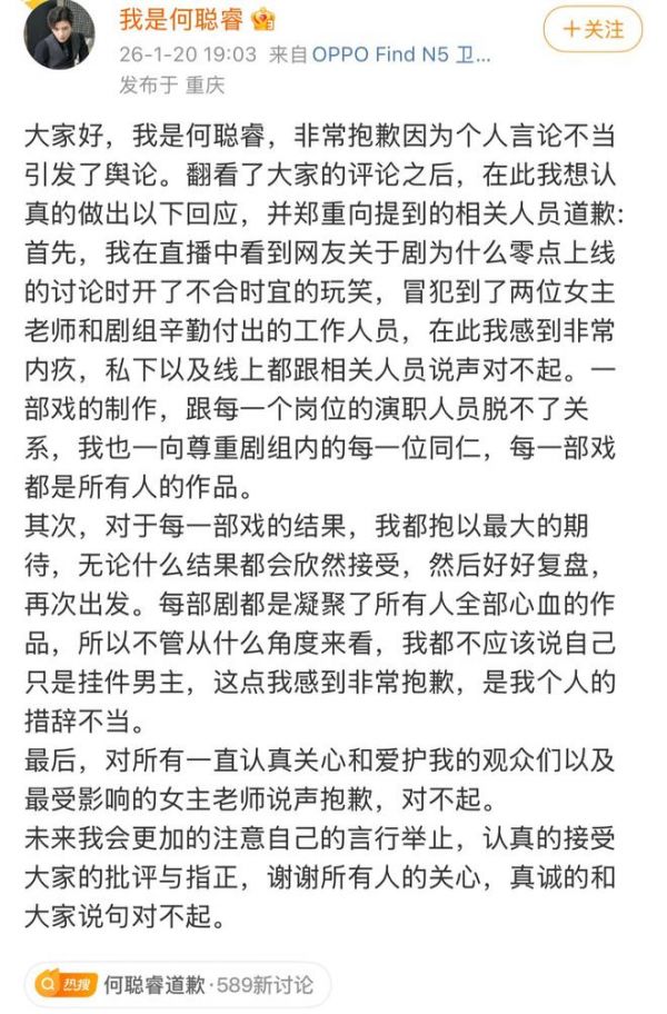 何聪睿剧扑甩锅女主,本人发声道歉:开了个不合时宜的玩笑