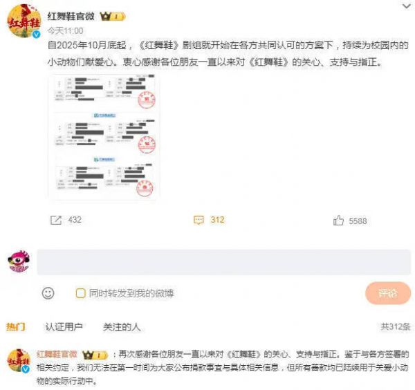 近日,《红舞鞋》剧组通过官方微博发文,并公开了相关捐款记录,回应去年在云南大学拍摄期间发生的撞猫事件引发的争议。文中表示:“自2025年10月底起,《红舞鞋》剧组就开始在各方共同认可的方案下,持续为校园内的小动物们献爱心。”