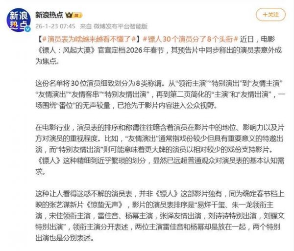 在影视圈,演员表的排序和头衔从来都不是小事,它暗戳戳地标定了演员的咖位、戏份轻重和片方的“端水”艺术。比如,“友情出演”通常指戏份不多但分量重的特邀,而“特别友情出演”听起来就更像是给大牌留的体面位置。《镖人》这种恨不得给每个演员都单开一个“赛道”的做法,显然已经超出了普通观众“谁演主角、谁演配角”的基本认知需求。