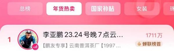据网友统计,李亚鹏在开播半小时带货就超过500万大关,1小时突破1700万大关,而且直冲带货榜第一名。
