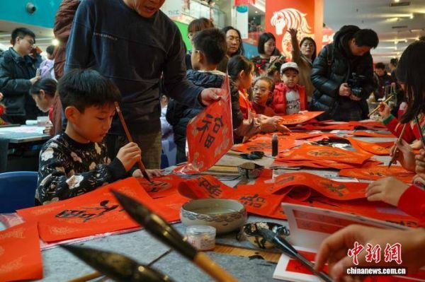 图为少年儿童书写福字对联。中新社记者 佟郁 摄