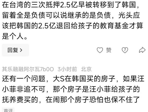 有网友猜大S拿到的豪宅抵押款,被她拿去韩国给具俊晔买了房子。当然,这一点,至今没有任何相关人承认过。