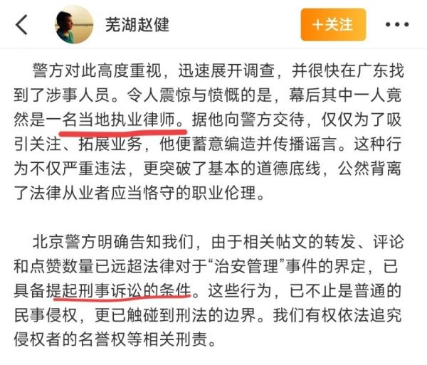 按照赵健的说法,此前,他委托的律师进行调查取证时,竟然意外地发现,其中一个传播范围广到可以立案的造谣者,其本人就是一个有正规执法从业资格、带牌照的律师。