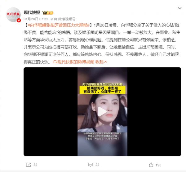 向华强曝张柏芝曾因压力大出现心理问题 拿下影后重拾自信