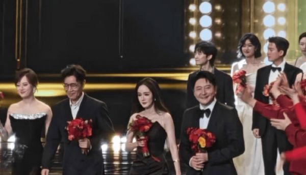 杨幂以黑长直发型搭配鎏金礼裙, 手持捧花登场,清冷贵气感拉满。