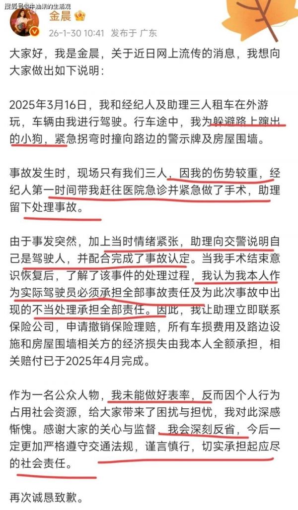 至于后面说的骗保什么的不存在,内容少但信息量比较大。很快,金晨就发文道歉,并且说明了自己为什么肇事逃逸,为什么顶包,但否认了骗保。