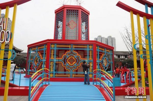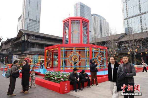 四川成都:融合走马灯、中国结元素的大型装置亮相街头