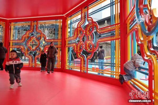 1月30日,四川成都街头一座大型艺术装置吸引市民打卡。这座艺术装置名为《骐骥织光 福马迎春》,其融合了走马灯形态之美与中国结编织之妙,以灵动线条交织传统匠心。中新社记者 张浪 摄