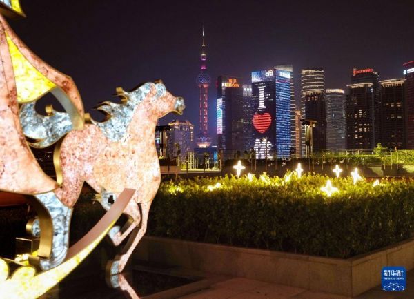 2月1日晚,BFC外滩金融中心露台上的骏马造型花灯与浦江夜景相辉映。新华社记者 刘颖 摄