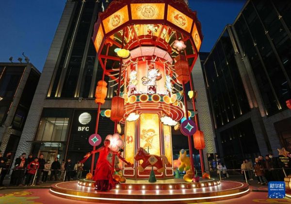 2月1日晚,宫灯造型的旋转木马装置在BFC外滩金融中心前点亮,启动新春游园会。