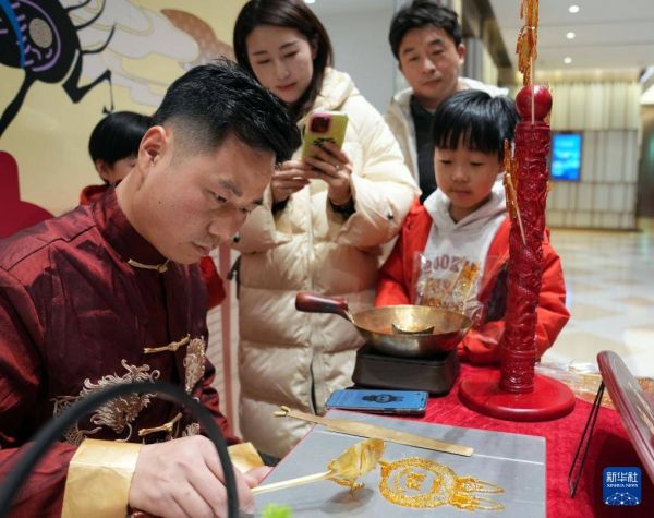 2月1日晚,在BFC外滩金融中心商场,手工艺人制作玩偶糖画。新华社记者 刘颖 摄