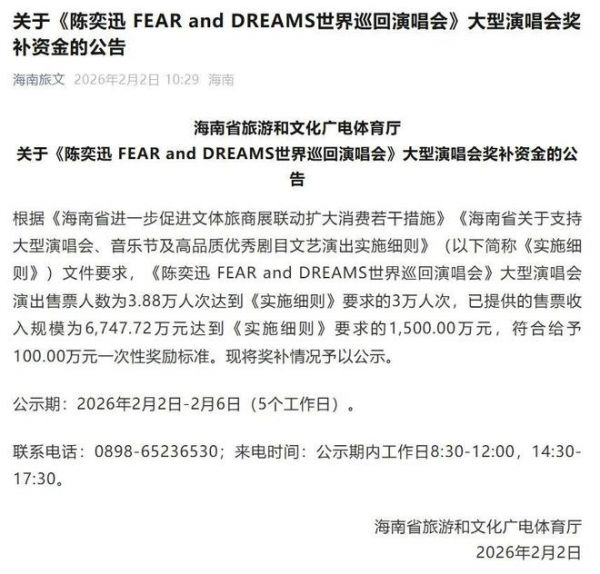 近日,海南省旅游和文化广电体育厅一则奖励公示引发热议:陈奕迅海口演唱会获100万元一次性奖励,张学友同地演唱会获50万元奖励,网友对此褒贬不一、争论不休。
