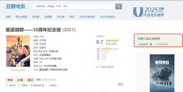 2017年,电影《重返·狼群》上映;2021年,《重返狼群10周年纪念版》纪录片在优酷独家上线,更完整地补充了很多电影没来得及讲述的内容素材。如今纪录片翻红,不少新的观众纷纷来优酷站内观看这部老片。今年1月中旬,《重返狼群10周年纪念版》纪录片的第11、12集重新在优酷“满血上线”,这是目前全网唯一的纪录片完整版。