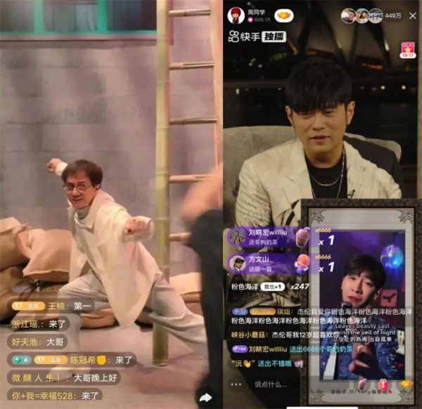同一时期,成龙也入驻快手,主打动作片情怀与接地气互动,直播首秀3小时观看人次超2.2亿,互动量3.2亿,直接刷新了快手直播历史纪录。