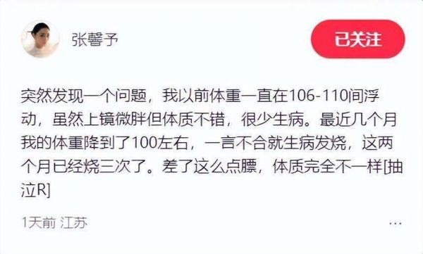 张馨予透露体重降至100斤后体质明显变差