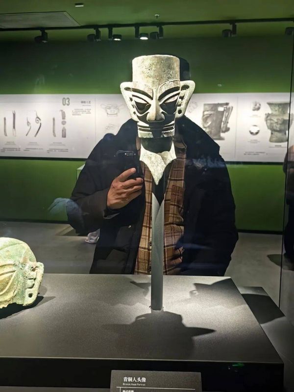 可当我面对三星堆的青铜面具时,那些生活化的幽默瞬间褪去,只剩下深深的震撼与好奇。展厅里的面具们姿态各异,有的戴着高冠,有的露出獠牙,有的眉眼细长如柳叶,有的额头刻着繁复的云纹。最让我着迷的是那些“方脸面具”,棱角分明的轮廓,平直的发际线,仿佛是用直尺量过一般,透着股不容置疑的威严。讲解员说,这些面具可能是古蜀国王侯或巫师的象征,用于祭祀等重要场合。我盯着面具上那双没有瞳孔的眼睛,忽然觉得它们像是在凝视着我,又像是在凝视着遥远的时空,那沉默中似乎藏着无数秘密,等着后人去解读。