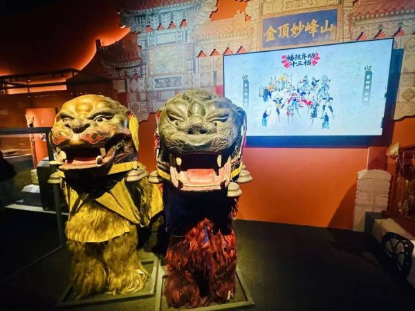 展览中的新春场景和清代舞狮道具/记者拍摄