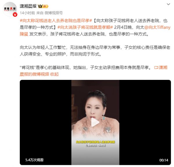 2月4日晚,向太发文表示,孩子肯花钱将老人送去养老院,也是尽孝的一种方式。