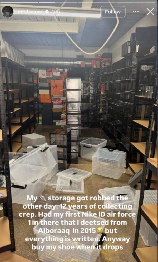就在前几天,Central Cee 突然在社交媒体上发了一段让人心碎的动态:他的整个鞋子收藏被偷了!不是丢几双,而是整整12年攒下来的心血啊!从2015年他亲手定制的第一双 Nike ID Air Force 1,到各种限量球鞋、grail 款,全都被一扫而空。他po出仓库被翻得乱七八糟的照片,透明收纳箱散落一地,空荡荡的架子看得人直叹气。