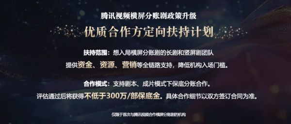 今年1月的腾讯视频短剧私享会上,腾讯视频对分账规则与激励政策进行了更新,其中也有一些值得关注,如宣布将长剧、中剧、短剧三大横屏品类的分账规则全面拉通,打破体量壁垒;以及针对有志于进入横屏分账剧领域的长剧、竖屏剧优质团队,将提供从资金、资源到营销的全链路支持,包括不低于300万/部的保底金。