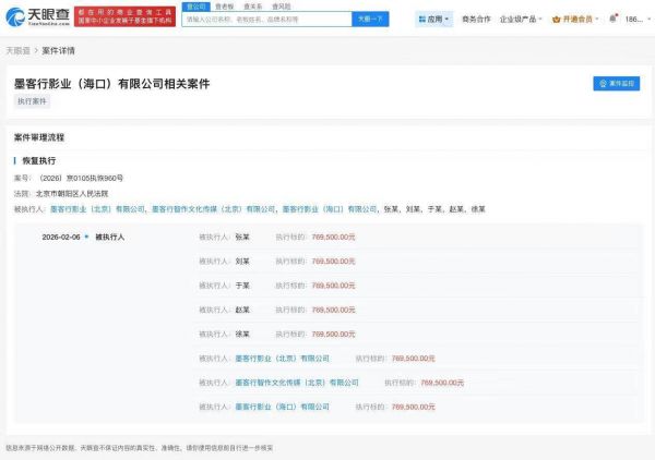 墨客行影业成立于2019年1月,经营范围包括电影摄制、文化艺术交流活动等。此次恢复执行意味着相关债务纠纷案件进入了新的执行阶段。