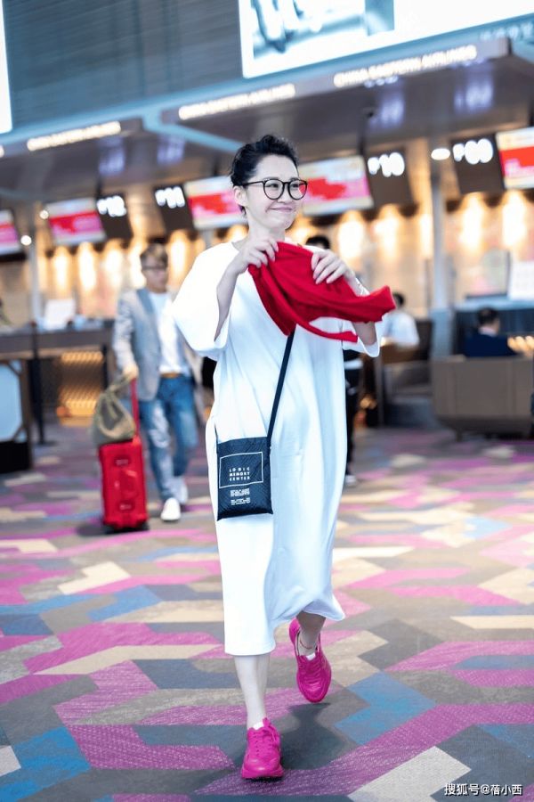 脚上运动鞋颜色很亮,火龙果色鞋子在搭衣服时比较挑颜色,要不然会翻车。斜挎包的肩带挺细,与裙子的松弛感完美呼应。包身还印有白色图案,在颜色上形成反差。黑框眼镜的出现让人多了一丝文艺气质,这身穿搭很显年轻,抛开鞋子,裙子与包包、眼镜可在炎热的夏季出门配着。