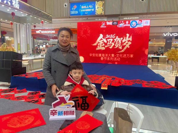 最受居民欢迎的环节莫过于“笔墨送福”。多位书法爱好者及社区书法家现场挥毫,笔走龙蛇,一副副寓意吉祥的春联、一个个饱满的“福”字跃然纸上,墨香四溢。辛安街道综合文化站、辛安街道新联会工作人员在活动现场志愿服务,现场群众有序排队,免费领取这份带着温度与祝福的新春礼物,脸上洋溢着喜悦的笑容。“手写的春联更有年味,贴在门上感觉特别喜庆!”一位捧着新鲜出炉对联的居民高兴地说。